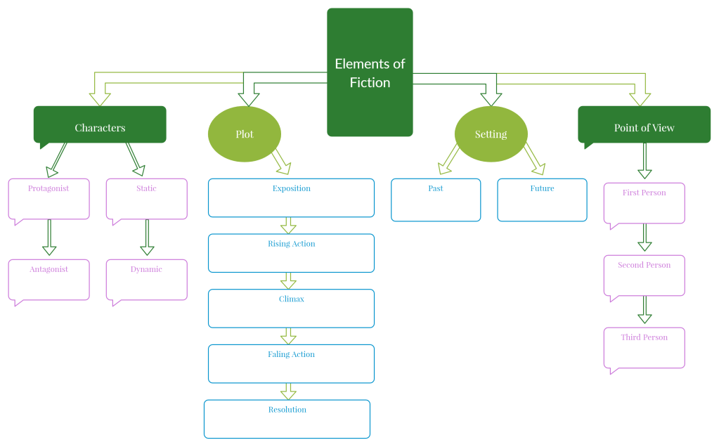 In this assignment the class was instructed to create a concept map or a graphic organizer using a free program to do so. I selected the website Creately.com. There was a wide selection of shapes to use as the text boxes, a large arrange of colors, and many styles to make the text boxes look more appealing. Within the settings, there were also choices as to where in the shape the words would line up, being either the top, center, or bottom. The controls were easy to figure out to move around the page while creating the map. The zoom feature was also very helpful. With this project I tried to create a combination between a mind map and graphic organizer. The topic I selected was elements of fiction stories. I gave four main topics within that category and then broke them down into subcategories. I tried to place the headings in each text box up high enough to allow room for students to fill out any definitions or thoughts that come to mind if I were to use this sheet in an actual lesson. Below I have an image of what I created.